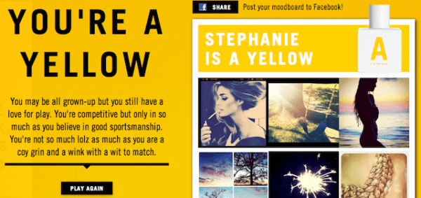 Đầu tiên, Microsite mời khách chơi một trò chơi trên Facebook. Sau khi đăng nhập vào Facebook, người dùng sẽ được cung cấp nhiều hình ảnh Instagram để xác định tâm trạng của bản thân. Sau khi chọn 9 hình ảnh, họ được cung cấp một bảng moodboard có mô tả ngắn gọn về tính cách để đăng lên Facebook cá nhân. Họ cũng có tùy chọn chia sẻ bảng này trên các mạng xã hội khác. Mỗi tâm trạng được kết hợp với một mùi hương cụ thể và một liên kết để mua mùi hương đó tại trang “A is for Aldo”. Kết quả cuối cùng là để ALDO tạo ra trải nghiệm hình ảnh có thương hiệu cho khách hàng của mình.