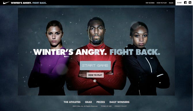 Vào năm 2011, Nike đã tạo ra một trò chơi trực tuyến, cho phép người chơi giúp các vận động viên giữ ấm khi họ tập luyện ngoài trời trong cái lạnh của mùa đông. Đó là một phần trong chiến dịch quảng cáo trang phục thể thao mùa đông của nhãn hàng.