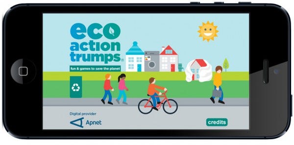 Eco-Action Trumps là một trò chơi bạn bè. Đầu tiên bạn chọn mười thẻ hành động vì môi trường, còn đối thủ chọn trong số các thẻ còn lại. Sau đó ứng dụng sẽ công bố một số điểm thể hiện tác động môi trường của từng bộ bài - và người chơi có số điểm cao hơn sẽ chiến thắng. Đây là một ví dụ điển hình về ứng dụng kết hợp Động lực cốt lõi số 5: Ảnh hưởng xã hội và Khả năng liên hệ và Động lực cốt lõi số 7: Tính khó lường & Cảm giác tò mò.
