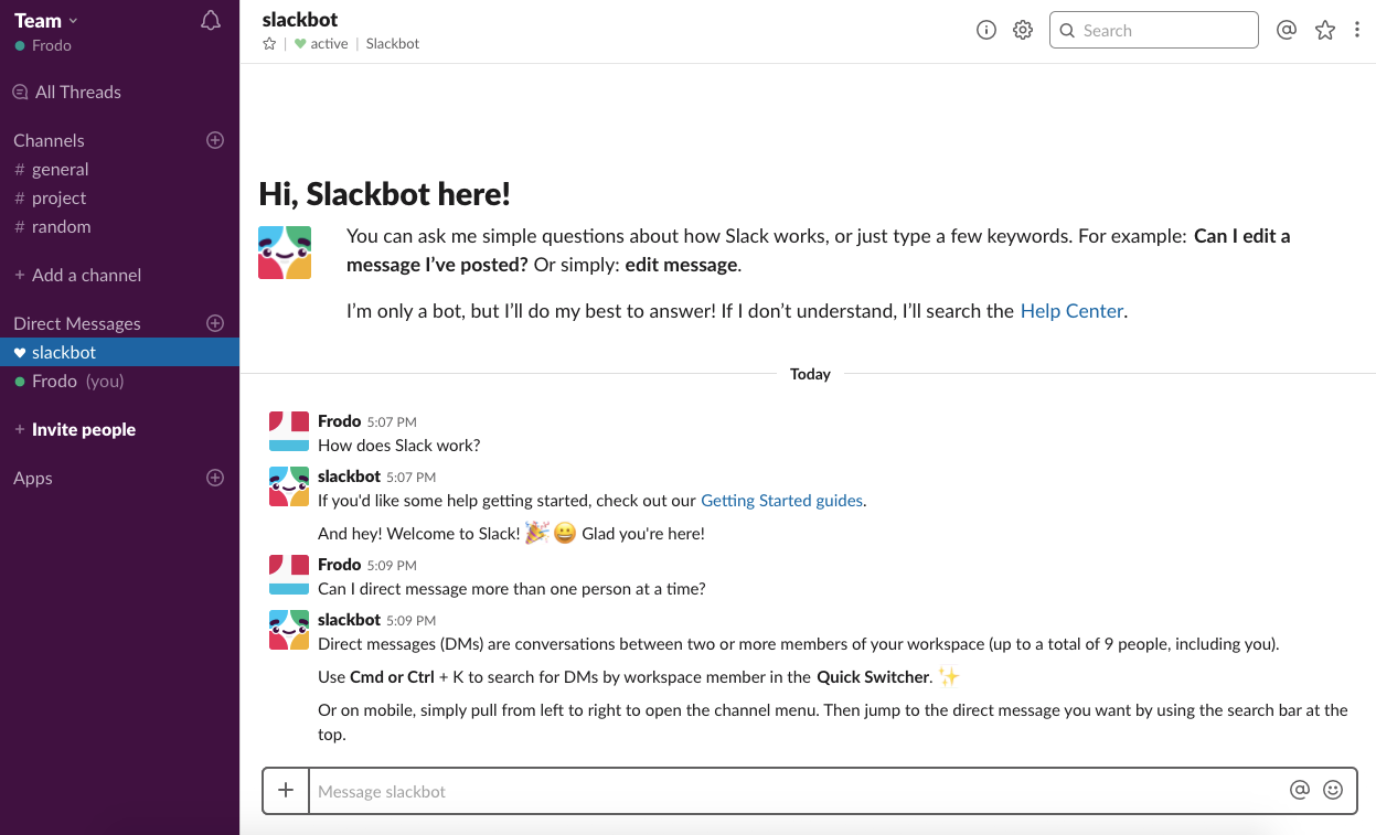 Khi một người dùng sử dụng Slack lần đầu tiên, họ sẽ ngay lập tức được mời tham gia trò chuyện với Slackbot. Benjamin Brandall, chủ nhân của Process Street, đã phân tích những điều mà người dùng học được thông qua Slackbot là: