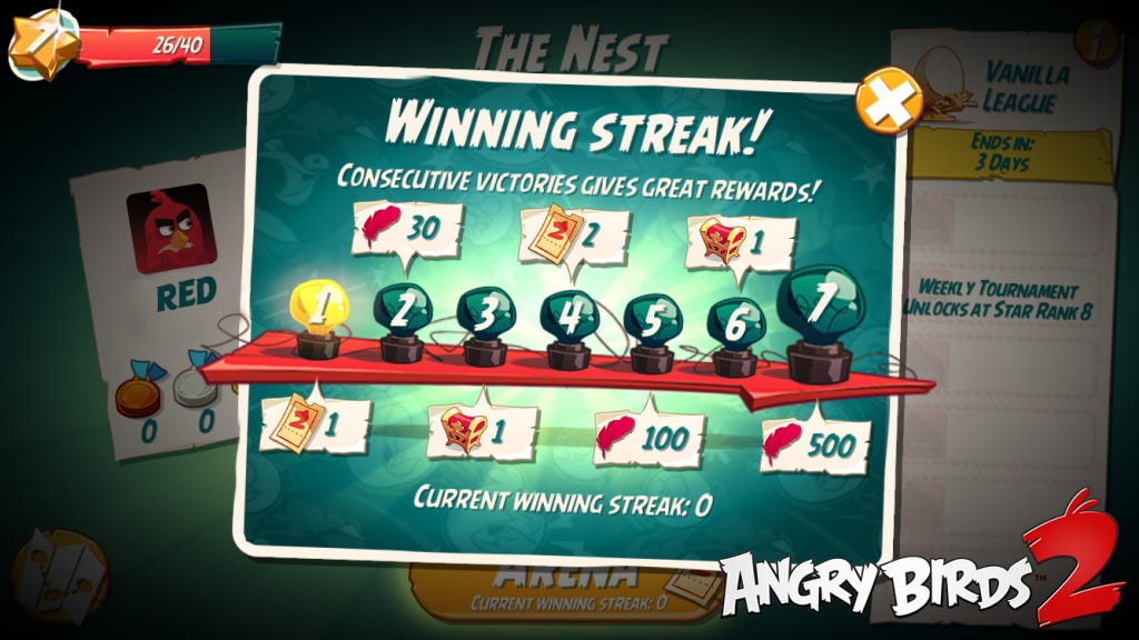 Cụ thể, Angry Birds 2 sẽ thưởng cho người chơi mỗi khi họ đạt được chuỗi liên thắng trong chế độ PvP (tối đa bảy trận mỗi ngày). Với mỗi chiến thắng được cộng vào chuỗi, phần thưởng sẽ tăng lên theo. Tuy nhiên, nếu bạn để thua một trận thôi, chuỗi sẽ biến mất và bạn phải tích lũy lại từ đầu.