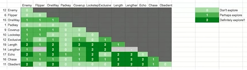 Liệt kê tất cả các hành động hay tương tác có trong trò chơi của bạn, xếp chúng thành các tổ hợp rồi xây dựng câu đố với tổ hợp đó là đáp án. Ví dụ, nếu trò chơi của bạn có các hành động A, B và C, hãy thử tạo một câu đố mà người chơi bắt buộc phải thực hiện A trước B sau, một câu đố khác với B trước và A sau, rồi một câu đố khác nữa với đáp án là AAB, ABA hoặc ABB,...