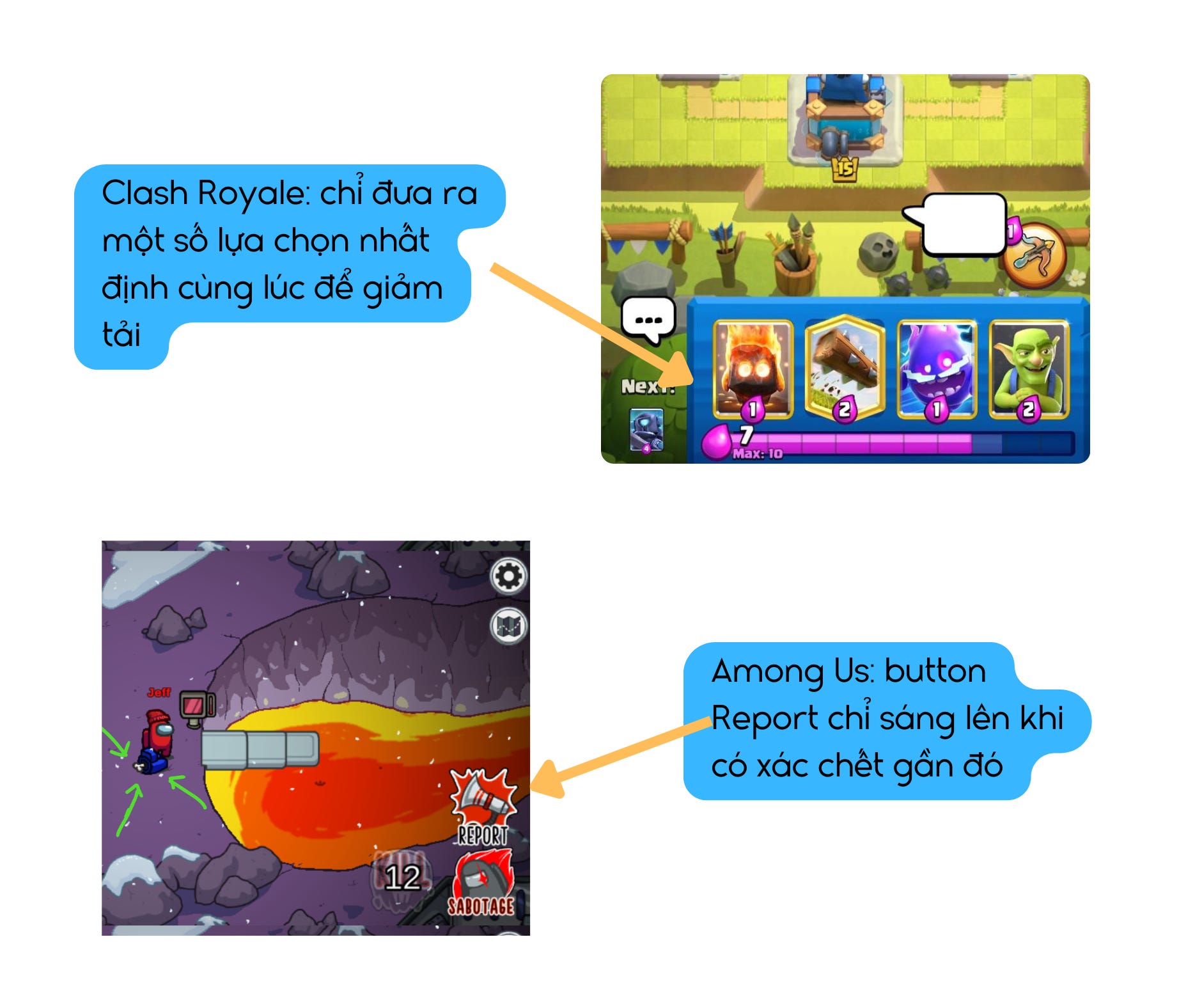 Hạn chế số lượng thông tin trên màn hình: Ví dụ, trong Clash Royale, chỉ có một số lượng quân bài tối thiểu được hiển thị cùng lúc, giúp người chơi không bị quá tải trong việc ra quyết định.