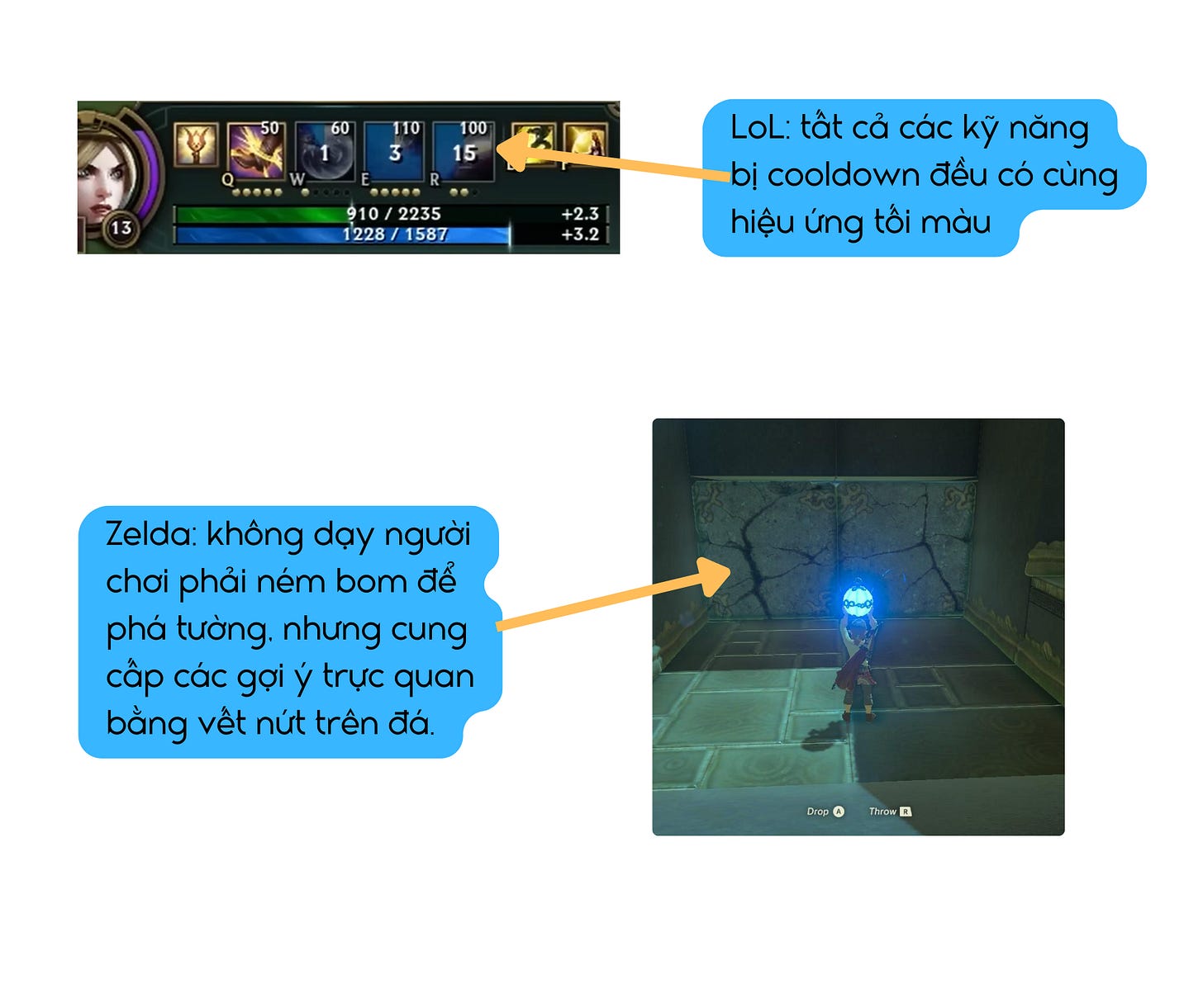 Giúp người chơi tự khám phá thay vì nhồi nhét thông tin: Thay vì liệt kê tất cả các mẹo chơi, game có thể khuyến khích thử nghiệm bằng cách gợi ý thông qua môi trường. Zelda: Breath of the Wild không dạy người chơi phải ném bom để phá tường, nhưng cung cấp các gợi ý trực quan bằng vết nứt trên đá.