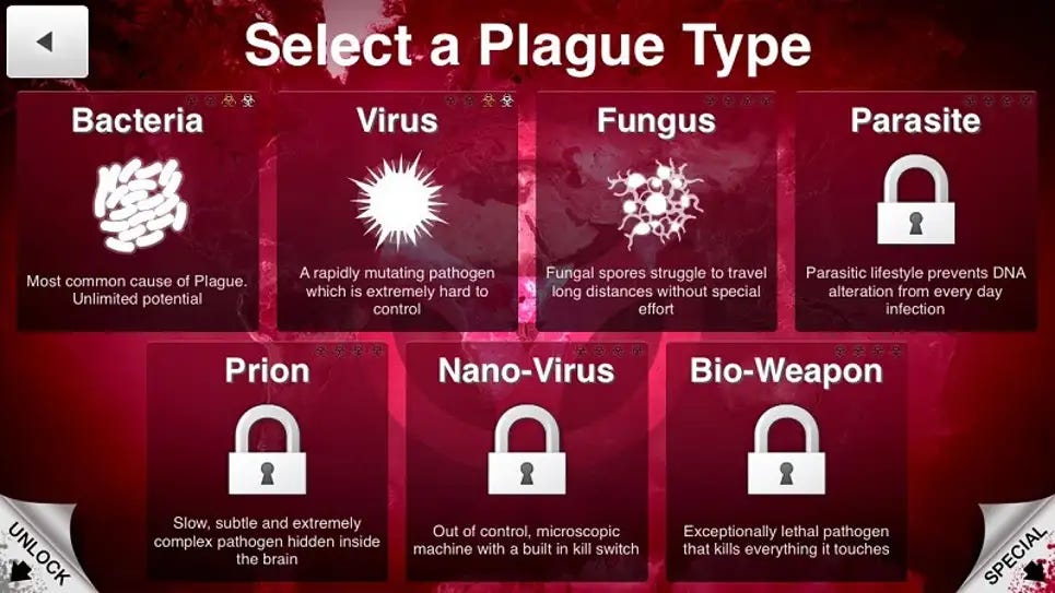 Khi trò chơi bắt đầu, bạn sẽ được chọn nơi ở của người nhiễm đầu tiên (hay F0) còn sau đó các công cụ sẽ nhằm phát triển dịch bệnh. Bạn sử dụng “điểm DNA”, được tự động tích lũy theo số ca mắc, để đột biến các đặc tính mới như khả năng kháng thuốc hay dễ truyền nhiễm qua máu hoặc gây ra triệu chứng như ho, hắt xì, nôn mửa giúp bạn đi trước các nhà nghiên cứu một bước, khiến cho việc ngăn cản dịch bệnh thành một trở ngại.