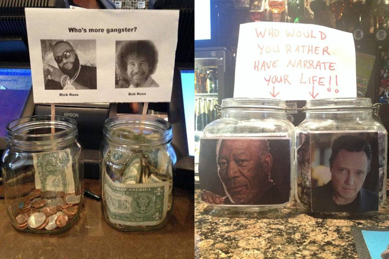 Chúng ta cũng có thể áp dụng nguyên lý tương tự vào thùng tiền boa (tip jar) đặt tại cửa hàng. Trên thực tế, đã có nhiều quán cafe ở nước ngoài đã áp dụng phương pháp này nhằm kích thích KH tipping. Một điều cần khá lưu ý là các chủ đề được chọn sẽ phải vừa mang tính “gây tranh cãi” nhưng lại không mang tính chia rẽ hoặc mang màu sắc chính trị. Một trong số những chủ đề dễ tác động được lên hành vi của KH tại Việt Nam nhất có lẽ có thể kể đến bóng đá nói riêng và tinh thần dân tộc nói chung—kiểu như “Bạn nghĩ đêm nay chúng ta sẽ ăn cơm Việt mặn chát hay là ăn lẩu Thái chua cay?”