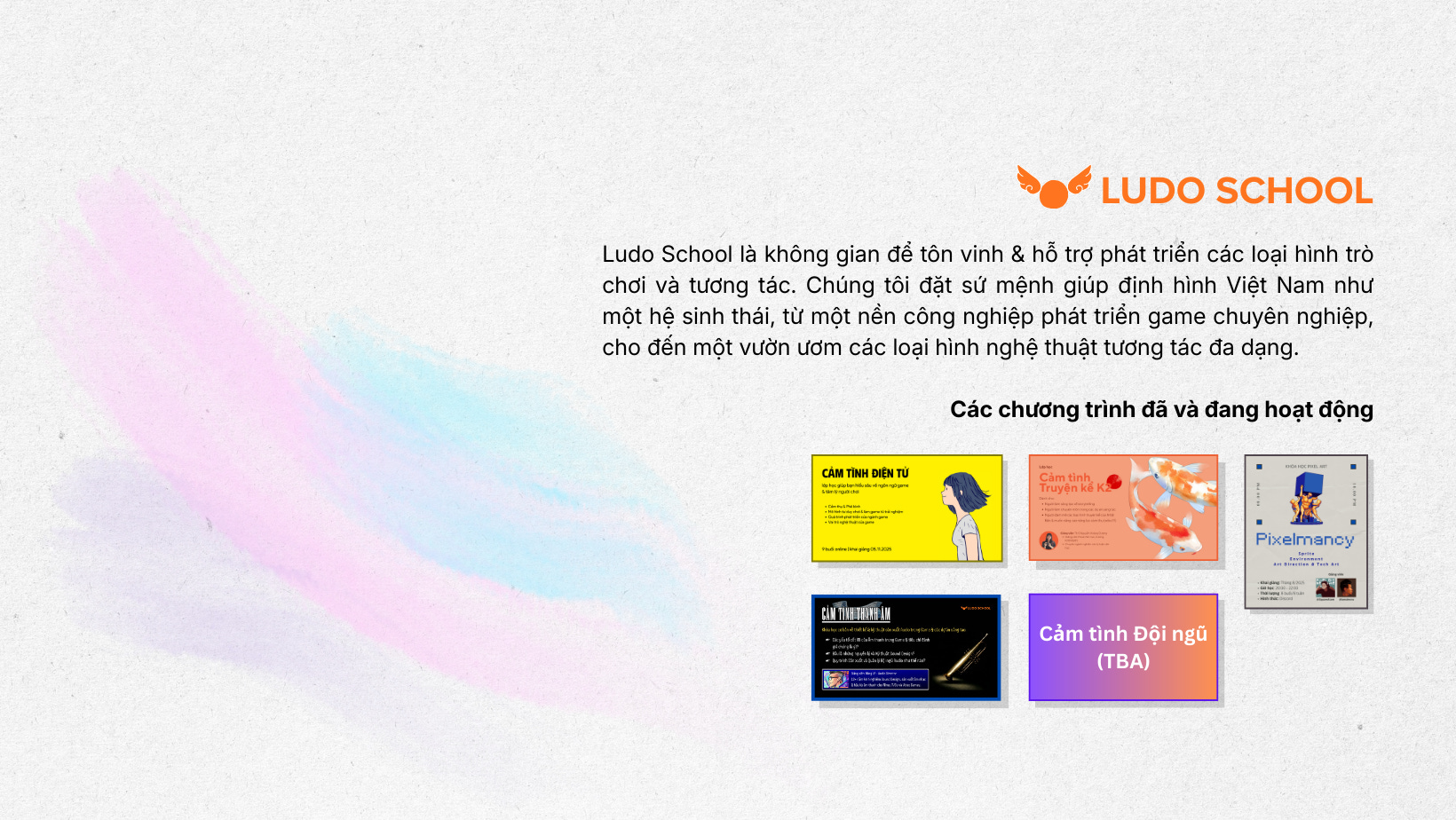 Hiện tại, Ludo School đã và đang triển khai 5 lớp học với các đề tài đa dạng. Dù nội dung khác nhau, tất cả đều xoay quanh một mục tiêu cốt lõi: góp phần định hình những tiêu chuẩn và xây dựng nền tảng con người sẵn sàng cho một tương lai mới của ngành công nghiệp game Việt Nam.