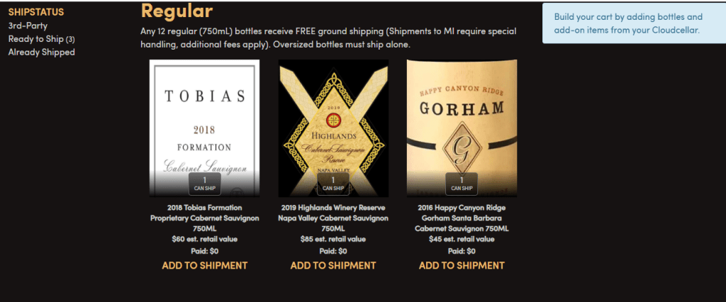 Tôi mua ba chai Cabernet Sauvignon, mỗi chai có giá 35 đô la. Tôi thực lòng không biết chính xác về nhãn hiệu hay màu sắc rượu mà tôi sẽ nhận được cho đến khi tôi đặt hàng. Cuối cùng tôi đã mua ba chai rượu vang với trị giá 45 đô la, 60 đô la và 85 đô la. Hai trong số chúng đã sẵn sàng để giao ngay trong khi một chai cần khoảng một tuần để có sẵn. Các chai rượu sẽ được cất trong "CloudCellar" của tôi thuộc Hầm rượu Ngầm ở Thung lũng Napa cho đến khi tôi sẵn sàng nhận rượu tại nhà.