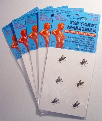 Chú ruồi nhỏ này biến sự bất tiện thành một trò chơi nhỏ hấp dẫn: Nó dường như thu hút đứa trẻ ẩn sâu bên trong mỗi người đàn ông cũng như đánh thức bản năng thợ săn nguyên thủy. Nó biến một hoạt động cá nhân nhàm chán thành một trò tiêu khiển rất đáng hoan nghênh: vào nhà xí bắn ruồi.