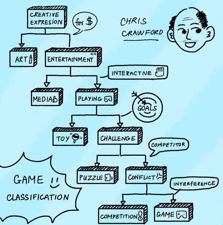 Nhưng ai mà nhớ được. Nhà thiết kế trò chơi Chris Crawford đã nghĩ ra một cách phân loại thú vị và có hệ thống để giải thích điều đó. Ông gọi tất cả những thứ bạn tương tác nhằm mục đích giải trí là “game”.
