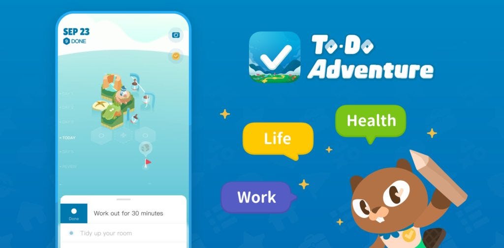 To-Do Adventure là một ví dụ điển hình về Game hóa hành động. Bất cứ khi nào bạn hoàn thành nhiệm vụ của mình trong To-Do Adventure, bạn có thể thêm một phần đất vào hòn đảo nhỏ bé của mình, lấp đầy nó bằng nhiều tính năng khác nhau, thậm chí có thể kiếm tiền để mua các chủ đề trang trí. Trong khi đó, các nhiệm vụ chưa hoàn thành sẽ được thể hiện bằng các công trình xây dở như những cây cầu hay đường trượt nước… Hoàn thành thật nhiều nhiệm vụ để hòn đảo của bạn trở nên phong phú và thú vị hơn.