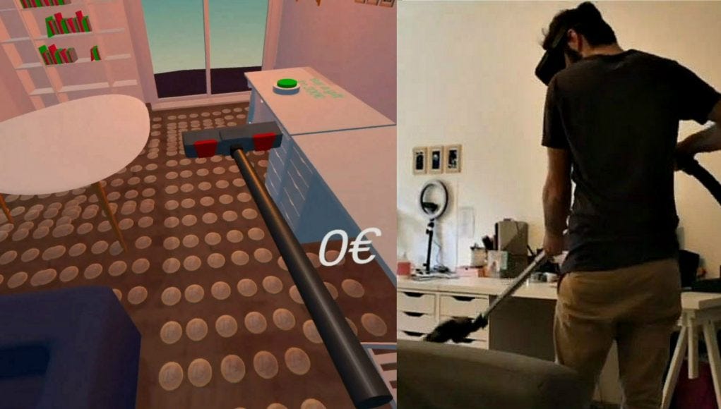 Một người dùng Reddit có tên VoxelGuy đã giới thiệu một minigame Hút bụi VR . Anh ấy xây dựng mô hình phòng khách nhà mình ở tỉ lệ 1:1, gắn vào máy hút bụi nhà mình bộ điều khiển Oculus Quest and Touch rồi hút sạch những đồng euro ảo trên sàn nhà. Số tiền ảo ấy sẽ được sử dụng để mua đồ trang trí ảo hoặc thay đổi giao diện phòng khách cho chân thực và nhập vai hơn.