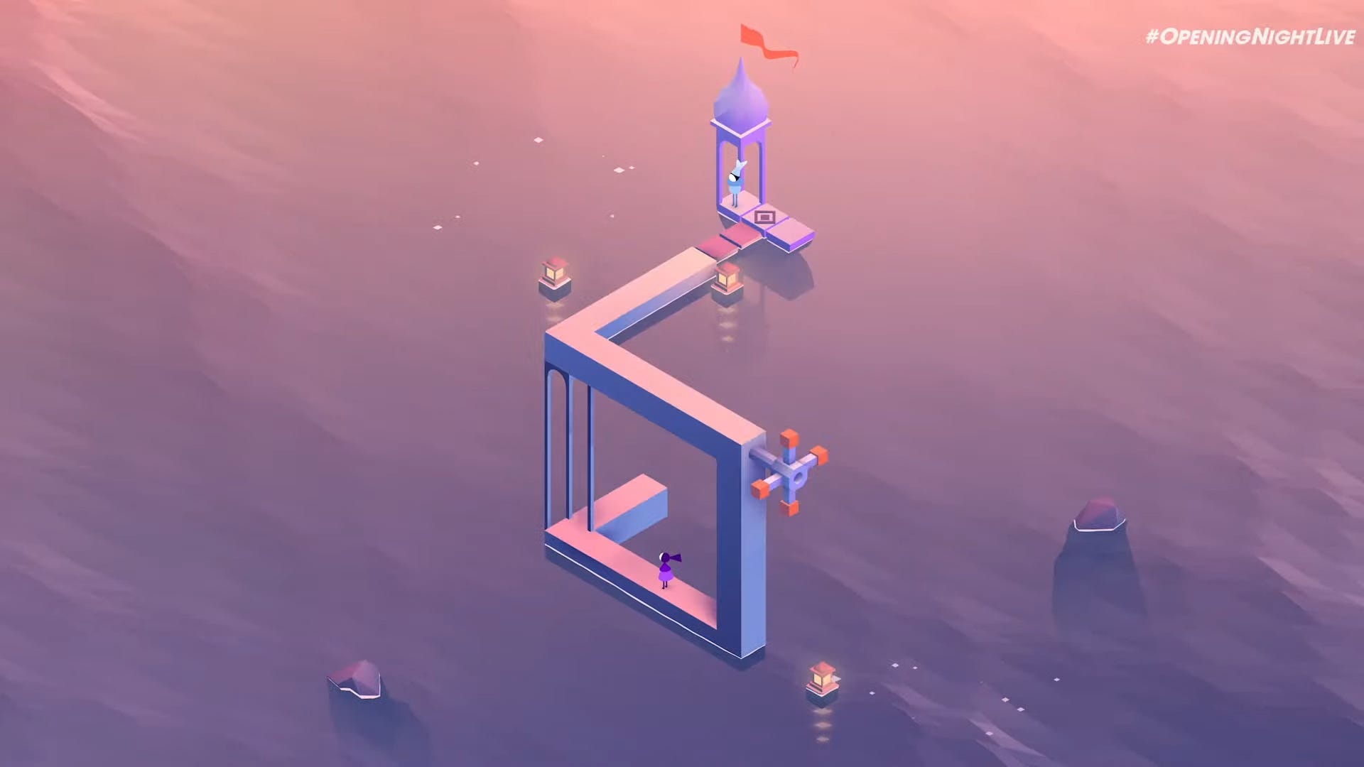 Monument Valley sử dụng màu sắc và hình dạng để gợi ý rằng cầu thang có thể xoay.
