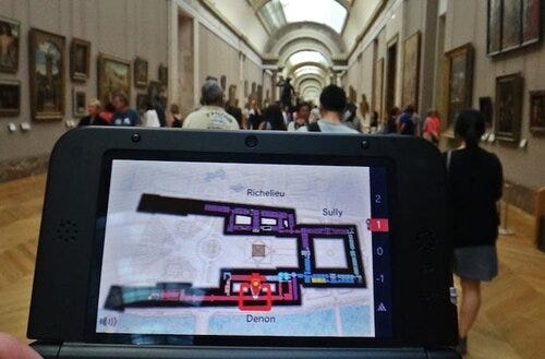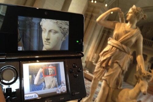 Bảo tàng Louvre ở Paris đã hợp tác với Nintendo để tạo ra trò chơi hướng dẫn âm thanh 3DS, đây là một ví dụ điển hình trong quan hệ đối tác giữa một bảo tàng và một công ty giải trí. Vào năm 2012, Nintendo và Louvre đã tạo ra Nintendo DS Louvre Guide, bao gồm một hệ thống GPS và một bộ hình ảnh 3D được thiết kế riêng cho bảo tàng. Hướng dẫn này có hơn "700 bức ảnh, hơn 30 giờ thuyết minh, cộng thêm những hình ảnh có độ phân giải cao, mô hình 3D và video tài liệu." Người dùng có thể phóng to hoặc xoay các tác phẩm nghệ thuật để xem chi tiết.