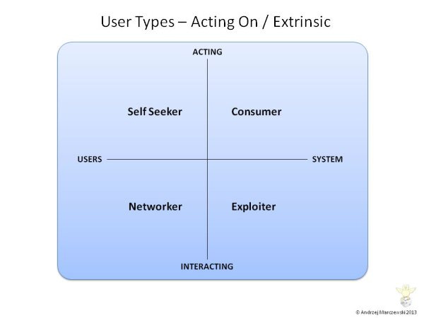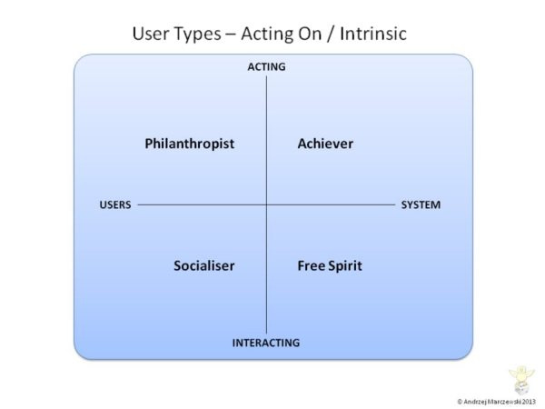 Sau khi kết hợp, chúng tôi hiện có 8 kiểu người dùng - 4 kiểu người dùng có động cơ nội sinh và 4 kiểu người dùng có động cơ ngoại sinh. Bây giờ người ta có thể xem 8 loại này đang hoạt động như thế nào trong một hệ thống Game hóa. Để minh họa rõ nhất điều này, Andrzej sử dụng quy ước trục ban đầu của Bartle, mô tả cách người chơi tương tác hoặc hành động với người chơi khác hoặc với thế giới ảo. Điều này dẫn đến hai sơ đồ, sơ đồ đầu tiên mô tả những người dùng có động cơ nội sinh, sơ đồ thứ hai là những người dùng có động cơ ngoại sinh.