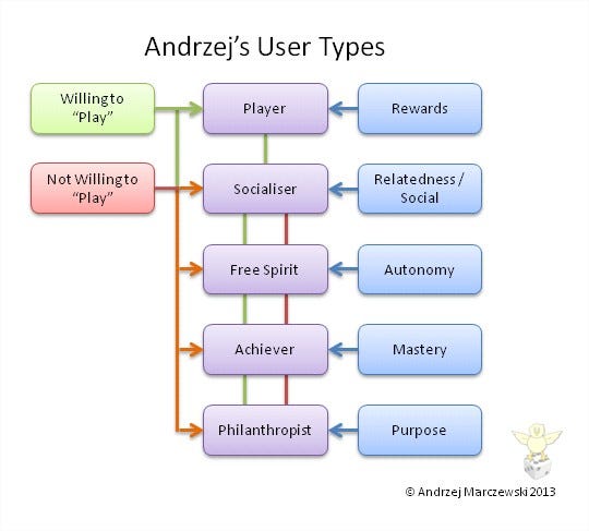 Sau khi trao đổi với Richard Bartle, Andrzej đã phát triển một quan điểm có cấu trúc hơn cho lược đồ kiểu người dùng của mình. Trong mô hình ban đầu, kiểu người dùng Người chơi là những người tìm kiếm phần thưởng ngoại sinh, họ luôn sẵn sàng chơi miễn là nhận được phần thưởng. Là một nhóm riêng biệt, họ có thể được chia nhỏ và phân loại theo nhiều cách, bao gồm cả Kiểu người chơi Bartle truyền thống.