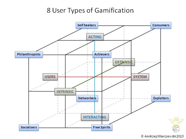 Andrzej Marczewski tin rằng chúng ta nên lùi lại và nhìn nhận với hai kiểu người chơi cơ bản, là những người “sẵn sàng” chơi và những người “không sẵn sàng” chơi. Theo Andrzej, những người “sẵn sàng” có thể tham gia vào trò chơi với những yếu tố ngoại sinh như huy hiệu và danh hiệu. Nhiều người có thể không quan tâm, nhưng nếu hệ thống được thiết kế để thu hút họ thì họ vẫn sẽ tham gia như thường.
