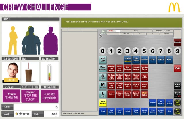 Với City & Guilds Kineo, đây là một công việc đầy thách thức. Chẳng bao lâu nữa, McDonald’s sẽ đưa một hệ thống gọi món và đặt hàng mới vào hoạt động. Họ muốn nhân viên của họ được huấn luyện về hệ thống đó trong một môi trường an toàn - nơi nhân viên có thể mắc lỗi mà không làm khách hàng tức giận và từ đó tiến bộ dần dần. Đồng thời, họ cũng muốn có kết quả kinh doanh tốt: cải thiện độ chính xác của các danh mục hàng hóa, giảm thời gian phục vụ và tăng lượng chi tiêu của mỗi khách hàng. Quan trọng hơn cả, họ muốn nhân viên trải nghiệm quá trình huấn luyện với niềm vui và sự hứng khởi.