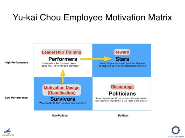 Một trong những lý do tại sao Khung Octalysis của tôi rất phổ biến là vì mọi người có thể liên hệ kiến thức với cuộc sống của chính họ và những lựa chọn mà họ đã thực hiện. Tôi hy vọng rằng mọi người sẽ cảm thấy như vậy đối với Ma trận doanh nghiệp nếu họ làm việc tại một công ty lớn.