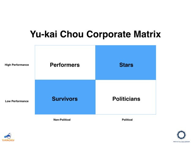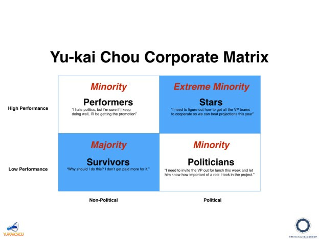 Ma trận 2 × 2 này chia mọi người thành bốn loại khác nhau: Hiệu suất thấp và Chính trị thấp, Hiệu suất cao nhưng Chính trị thấp, Chính trị cao nhưng Hiệu suất thấp và Hiệu suất cao và Chính trị cao.