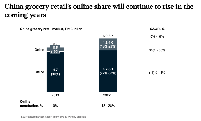 Mọi người hiện đã nhìn thấy lợi ích của mô hình kinh doanh này và vô số cơ hội. Quả vậy, McKinsey ước tính rằng thị trường hàng tạp hóa trực tuyến Trung Quốc sẽ tăng trưởng với tốc độ CAGR từ 30% - 50% trong hai năm tới. Đây không phải là một kênh phân phối khác dành cho những gã khổng lồ công nghệ, mà là một cách để tiếp cận các phân khúc khách hàng không thể tiếp cận cụ thể và số hóa toàn bộ quy trình mua hàng của họ.