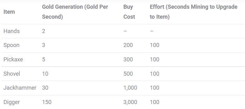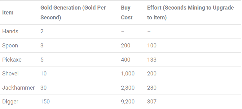 Hãy tham khảo bảng dưới đây, mô tả việc người chơi mua và trang bị các vật phẩm giúp tăng tốc độ khai thác vàng của họ: