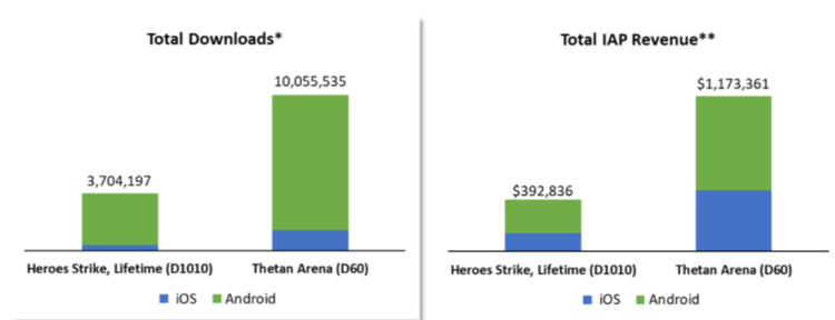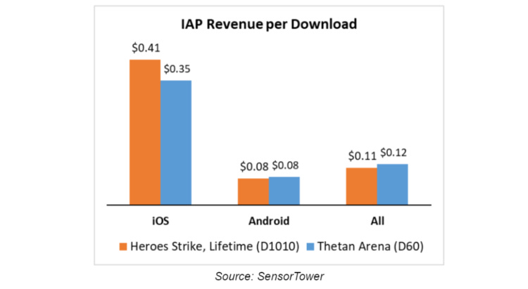 Mặc dù là một bản sao tốt của Brawl Stars, nhưng Doanh thu trên mỗi lượt tải xuống thấp (~0,40 USD trên iOS) đã khiến cho Heroes Strike không thể phát triển có lãi thông qua Chuyển đổi người dùng. Nó bị mắc kẹt ở các vị trí có doanh thu thấp nhất và không thể mở rộng quy mô, giống như hàng nghìn trò chơi F2P tương tự.