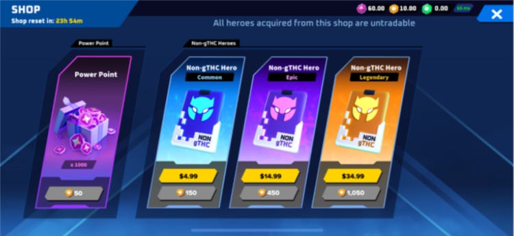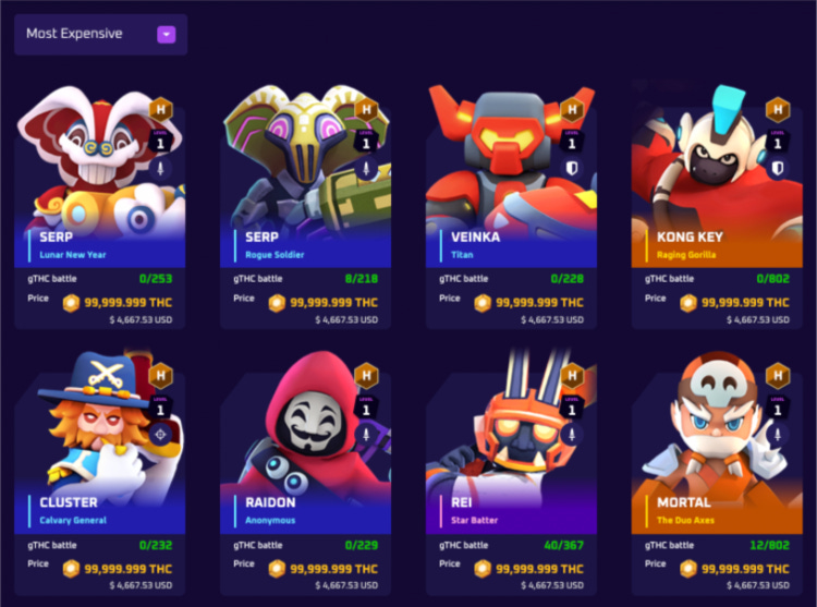 Nếu bạn quan tâm đến NFT, bạn có hai lựa chọn. Bạn có thể mua một gói gacha dưới dạng 3 rương hiếm với giá dao động từ 150 đô đến 5000 đô. Hoặc bạn có thể mua một anh hùng cụ thể trên thị trường từ một người chơi khác. Tại thời điểm viết bài, những anh hùng NFT này có giá từ 20 đô đến 5000 đô.