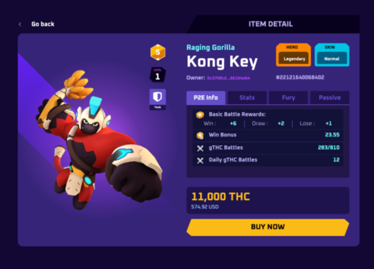 ET: Tôi đã lấy được Kong Key, là một anh hùng Huyền thoại mà nếu là dạng NFT sẽ có giá tầm 575 đô. Nếu tôi mua anh hùng này, tôi sẽ nhận được phần thưởng gTHC tốt nhất khi chiến thắng các trận đấu. Sử dụng tất cả các trận đấu mã thông báo của tôi mỗi ngày, tôi sẽ có khoảng 44 ngày chơi với chi phí 1,09 đô la cho mỗi trận đấu mã thông báo trước khi NFT của tôi mất tất cả tiềm năng kiếm tiền và như thế là mất tất cả giá trị bán lại.