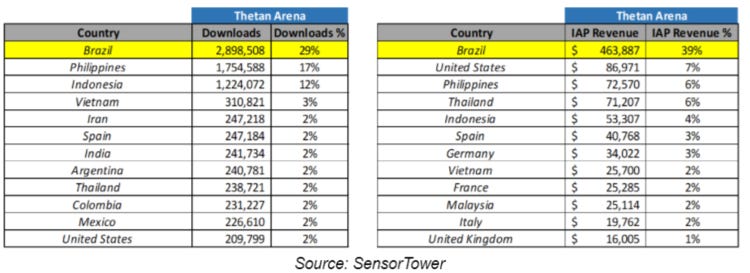 Một yếu tố liên quan đáng được nhấn mạnh về phạm vi tiếp cận và doanh thu là sự kết hợp giữa các quốc gia của Thetan Arena: xấp xỉ 60% lượt tải xuống đến từ Brazil, Philippines và Indonesia. Dữ liệu này phù hợp với các trò chơi P2E khác như Axie Infinity, trong đó các quốc gia kể trên chiếm tỷ lệ lớn trong cơ sở người chơi.