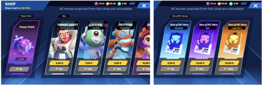 Thông qua IAP thông thường, người chơi có thể mua một số thứ không dựa trên blockchain và không khuyến khích chơi để kiếm tiền: các hộp nhân vật không phải NFT (không thể giao dịch và không tạo thêm tiền điện tử làm phần thưởng) và giao diện nhân vật.