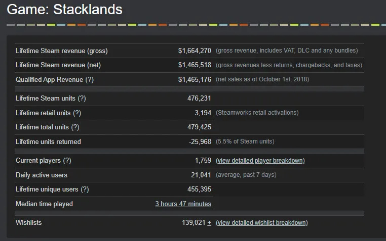 Chúng tôi đã liên hệ với Aran Koning của Sokpop và nhận được những con số đáng kinh ngạc: “Hiện tại Stacklands đã bán được khoảng 450 nghìn bản trên Steam. Chúng tôi cũng đã bán được khoảng 50 nghìn gói hỗ trợ cho Stacklands và Simmiland, một trò chơi khác của chúng tôi."