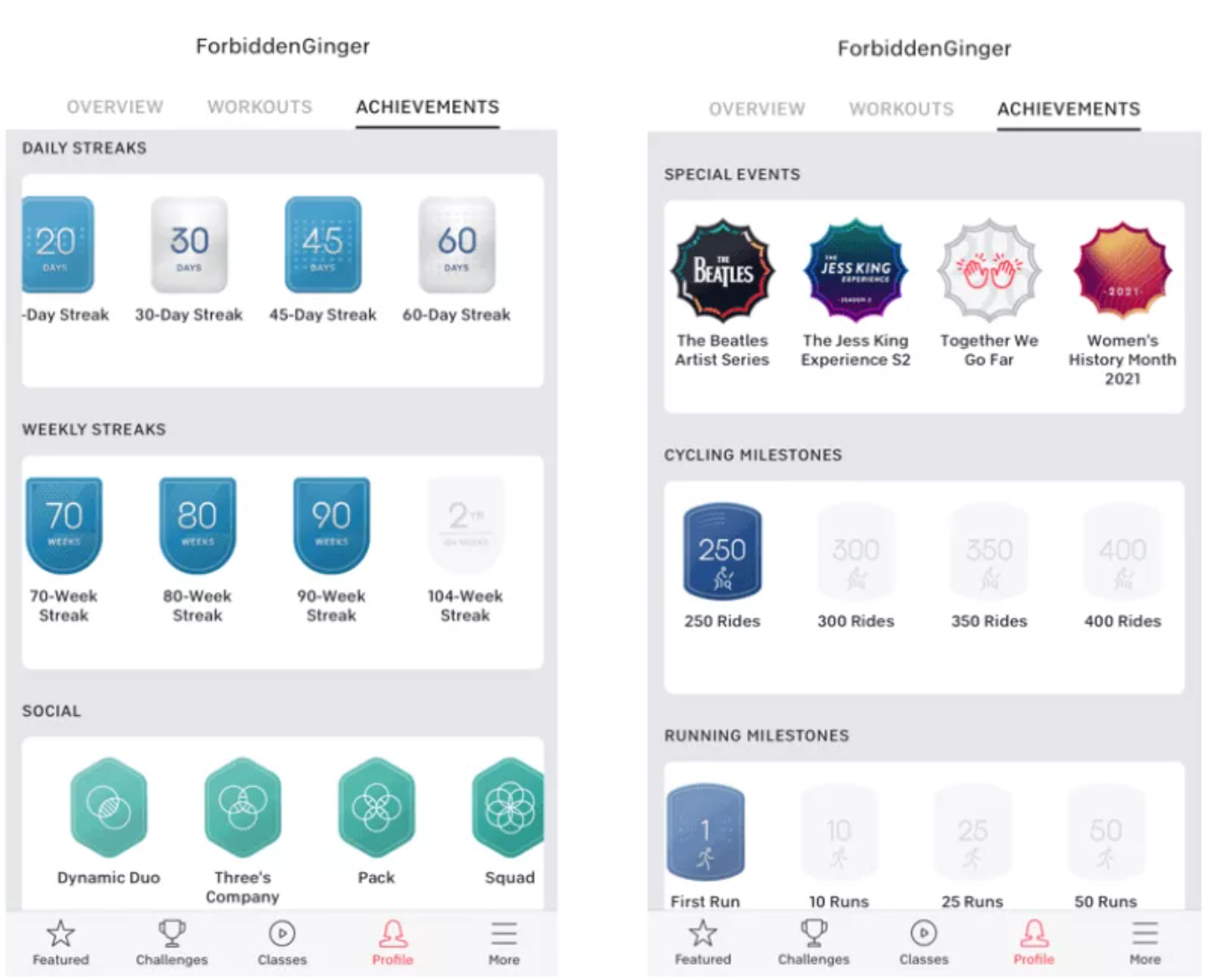 Đây sẽ không phải là một bài báo về Game hóa nếu không có sự xuất hiện của Peloton. Xe đạp tập thể dục ngày nay ít nhiều đã được coi là một mặt hàng và đôi khi thì là một giá phơi đồ sang chảnh. Nhưng không phải với Peloton. Chìa khóa thành công của Peloton nằm ở việc thương hiệu hóa trải nghiệm người dùng. Những người đi xe đạp Peloton được tưởng thưởng cho các cột mốc quan trọng trong quá trình luyện tập, ví dụ như người thực hiện 100 chuyến đi sẽ nhận được huy hiệu Câu lạc bộ Century màu bạc sáng bóng (cái này là kỹ thuật số) và một áo thun Peloton miễn phí (cái này không phải kỹ thuật số). Hãy xem một số huy hiệu và sự kiện quan trọng của tôi ngay bên dưới (rất hoan nghênh bạn kết nối với tôi trên Peloton, tên trên bảng xếp hạng của tôi là ForbiddenGinger).