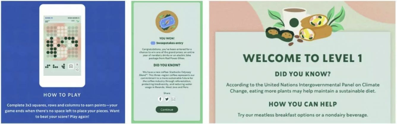 Starbucks không chỉ kỷ niệm Ngày Trái đất, họ kỷ niệm Tháng Trái đất với các trò chơi được thiết kế riêng để thúc đẩy các lựa chọn bền vững đồng thời quảng cáo các sản phẩm thân thiện với môi trường của thương hiệu. Đối với mỗi lần mua hàng trong tháng 4, các thành viên của Starbucks Rewards sẽ kiếm được một lần rút thưởng để có cơ hội giành được đồ uống không sữa miễn phí, giảm giá cho một số mặt hàng thực phẩm, hàng hóa có thể tái sử dụng hoặc các giải thưởng lớn như eBikes, đồ uống miễn phí cho một năm và hơn thế nữa. Các thành viên có thể kiếm thêm lượt chơi nhờ việc thu thập ống hút nhựa, thử các món không có thịt trong thực đơn và đọc các bài báo về rác thải thực phẩm. Với mỗi cấp độ đạt được trong trò chơi giải đố Play + Plant, các thành viên sẽ được ghi danh như đã đóng góp cho nỗ lực trồng 250.000 cây xanh của Starbucks. Tất cả những hoạt động kể trên đều hướng tới mục đích làm nổi bật sáng kiến Starbucks' Planet Positive, ủng hộ các sản phẩm thân thiện với môi trường.