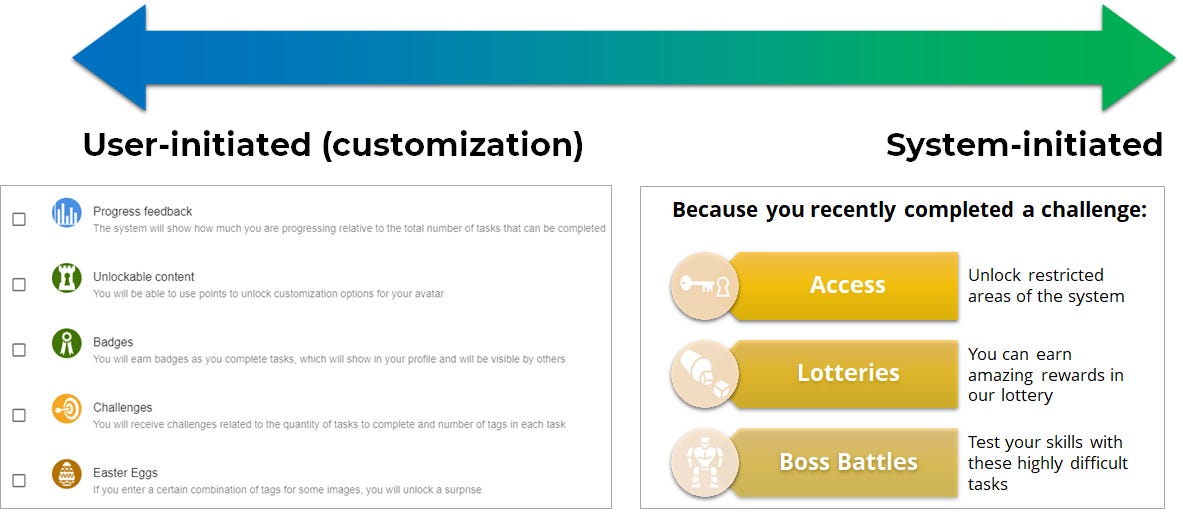 Một hệ thống trò chơi thường sử dụng các yếu tố thiết kế trò chơi tích hợp, mang lại trải nghiệm thú vị khi người dùng hoàn thành mục tiêu của họ. Để cá nhân hóa trải nghiệm, các yếu tố này cần được điều chỉnh theo sở thích của người dùng như có thể bật hoặc tắt hoặc điều chỉnh được khả năng hoạt động trong hệ thống.