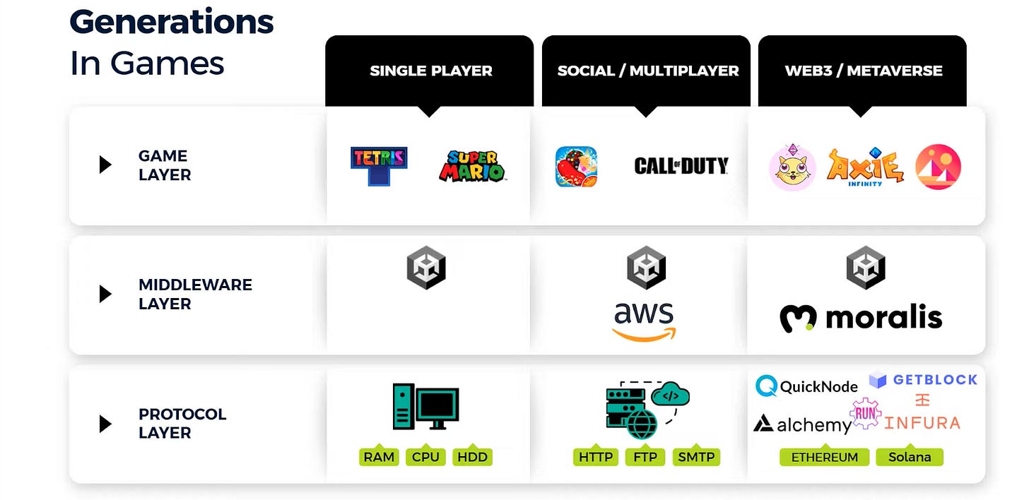 Như bạn có thể thấy trong hình trên, ở dưới cùng chúng ta vẫn có lớp giao thức. Tuy nhiên, khi di chuyển lên trên, chúng ta sẽ có lớp phần mềm trung gian và lớp trò chơi ở trên cùng. Nhưng hãy lưu ý rằng Moralis và sự tích hợp của nó với Unity đã cho phép các nhà phát triển tạo ra các trò chơi Web3 và thậm chí là metaverse của riêng Web3.