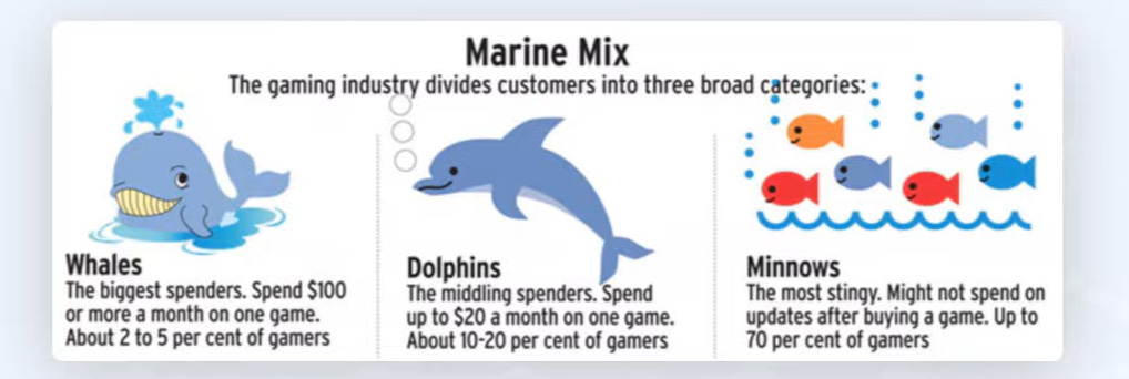 Người chơi còn có thể được phân loại dựa trên thói quen chi tiêu của họ (xem hình ảnh bên dưới). Khía cạnh này cũng khá quan trọng khi xem xét đến khả năng sinh lời của trò chơi. Đặc biệt trong các mô hình miễn phí để chơi, các giao dịch vi mô đóng vai trò khá quan trọng.