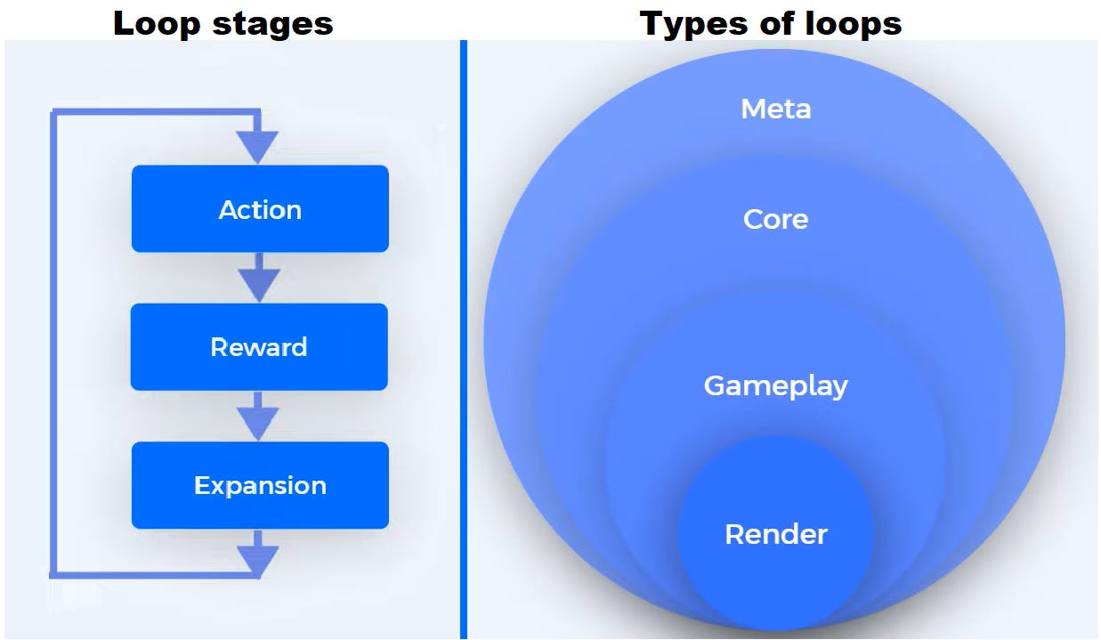 Một trò chơi truyền thống hay một trò chơi Web3 đều chứa một số lượng vòng lặp nhất định. Chúng thường là các vòng kết xuất, vòng lặp chơi trò chơi, vòng lặp cốt lõi và vòng lặp meta. Dưới đây là tổng quan về từng loại vòng lặp này:
