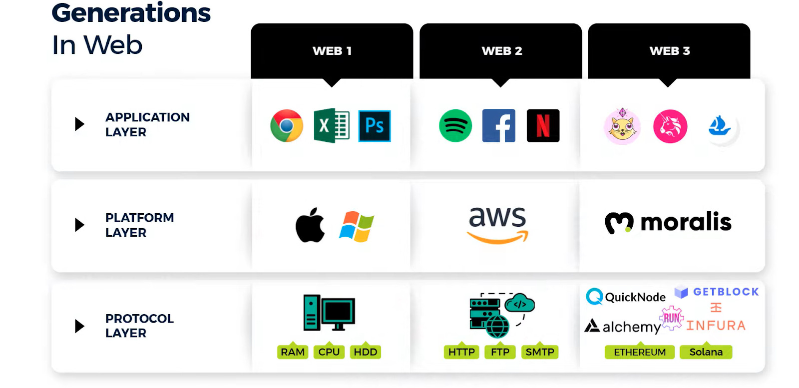 Hình ảnh trên cho bạn thấy ba lớp cơ bản của một cấu trúc web. Chúng bao gồm các lớp giao thức, nền tảng và ứng dụng. Nếu không có nền tảng và giao thức, các ứng dụng tốt nhất cũng không thể tồn tại. Tuy nhiên, với sự giúp đỡ của các nền tảng đáng tin cậy, giờ đây các nhà phát triển có thể bỏ qua việc xử lý các giao thức trực tiếp. Đổi lại, họ sẽ dành nhiều thời gian hơn cho frontend và do đó, tạo ra các ứng dụng tốt hơn hoặc trong trường hợp của Web3 là các dapp.