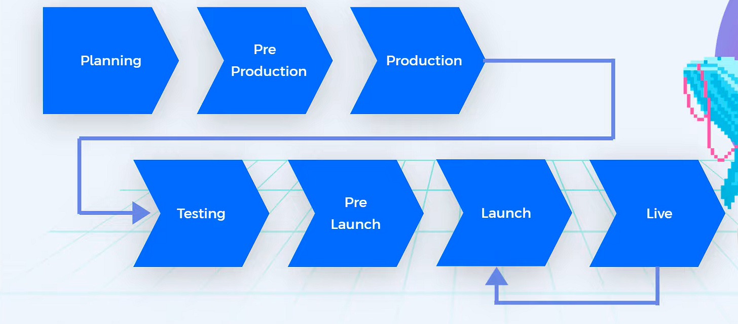 Hình ảnh trên chỉ ra các công đoạn điển hình nhất. Giai đoạn lập kế hoạch là lúc các đội quyết định mình sẽ làm trò chơi gì và người dùng sẽ tương tác với nó như thế nào. Công đoạn này đặc biệt quan trọng trong thiết kế trò chơi Web3 vì nó liên quan nhiều đến các tính năng tiền điện tử. Giai đoạn tiền sản xuất là để tạo mẫu và thử nghiệm, chuẩn bị cho giai đoạn sản xuất, nơi phần lớn trò chơi sẽ được tạo ra. Đây là lúc các nhà phát triển sẽ nhập các dòng mã và nội dung cuối cùng. Tiếp theo là thời gian thử nghiệm. Thông thường, sau khi thử nghiệm, chúng ta sẽ có giai đoạn tiền công bố để phát hành bản beta. Cuối cùng, nhóm sẽ công bố chính thức và khởi chạy trò chơi.