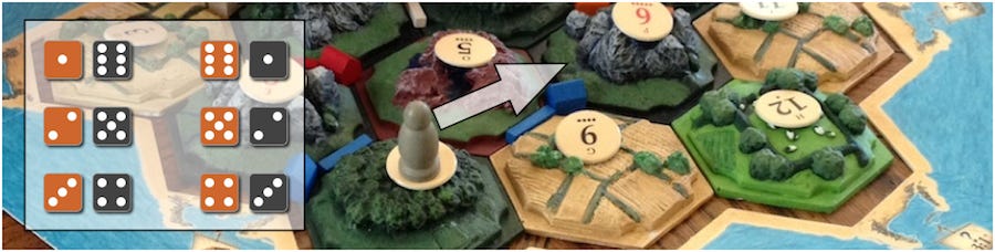 Có tổng cộng 36 kết quả cho xúc xắc 2d6. Trong số đó, có tổng cộng 6 tình huống để ra được tổng số 7. Đó là (1,6), (2,5), (3,4), (4,3), (5,2), và (6,1). Do đó, khả năng để thảy ra tổng số là 7 trên xúc xắc 2d6 là 6/36, tức ⅙. Điều này có nghĩa là trung bình, kẻ cướp trong Catan sẽ được di chuyển một lần trong mỗi sáu lượt.