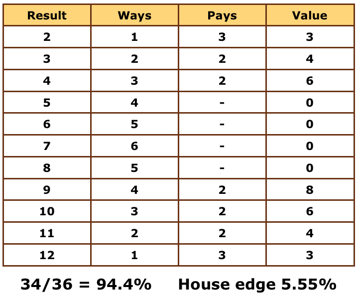 Cột cuối cùng, “Value,” là kết quả của Ways và Pays. Đây là giá trị tổng của tất cả các khả năng của mỗi kết quả. Ví dụ, có tổng cộng 2 cách để ra kết quả là 3, và giá trị thưởng của kết quả này là 2, vậy thì giá trị của kết quả này là 2 x 2 = 4. Tính tổng giá trị của tất cả các kết quả, ta có tổng là 34.