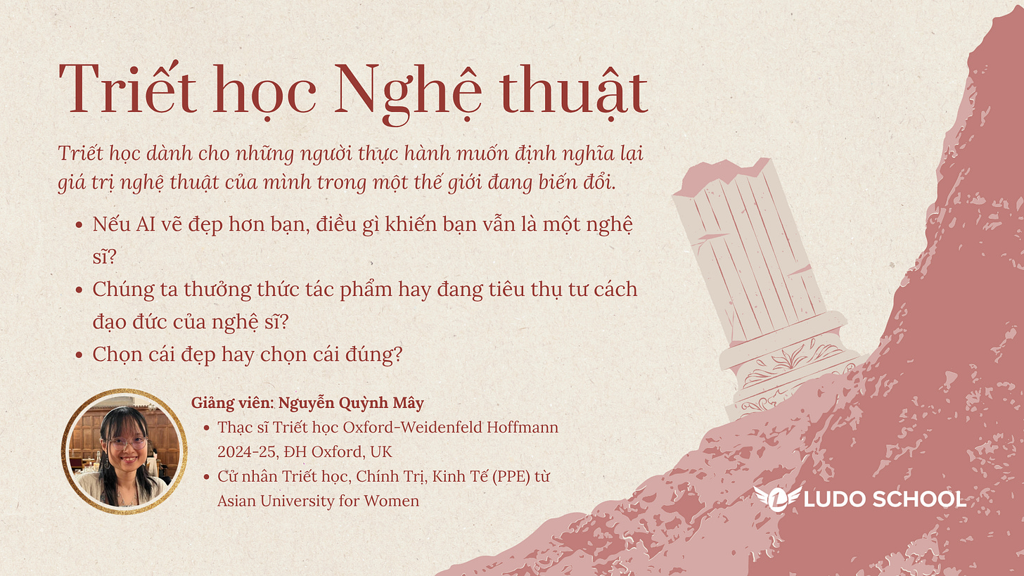 Và trong một bối cảnh đầy sự hoang mang như vậy, Hùng xin gợi ý cho mọi người một con đường khác--thay vì khổ sở chạy đua theo từng đợt sóng, con AI nào lên con AI nào xuống, việc nào nó làm được việc nào nó chưa, ai bị thay thế ai thì không--thì chi bằng trước hết chúng ta hãy back to basics. Quay về với những thứ bản chất nhất của những gì chúng ta đang làm. Và đó là lý do mà lớp học Triết học Nghệ thuật này ra đời.