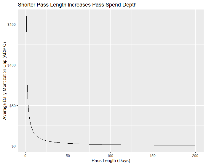Một cách đơn giản để tăng ADMC là tăng nhịp độ của BP. Hãy làm mới BP sau 8 tuần thay vì 12 tuần. Trong trường hợp của Fortnite, ADMC đã tăng lên gần 50% ($1,90 đến $2,86). Chúng ta có thể lập mô hình các tác động cận biên của việc thay đổi tốc độ làm mới BP:
