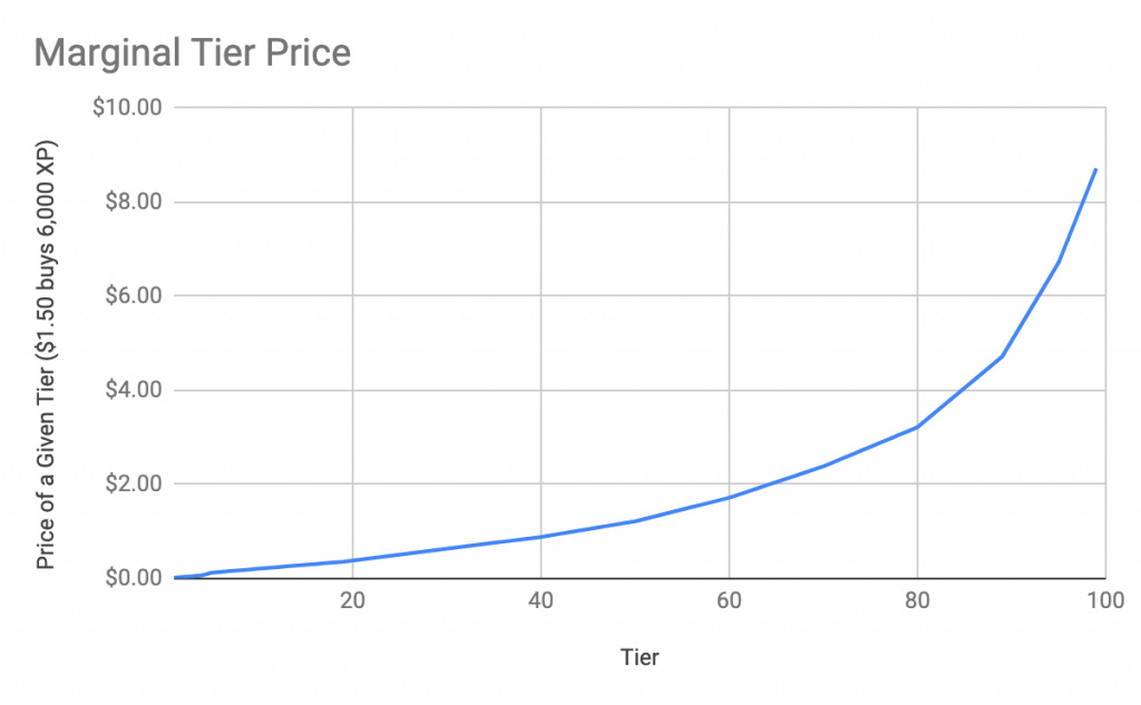 Ở mức 7.000 XP trên 1,5 đô la, định giá theo cấp cận biên tạo ra mức chi tiêu sâu hơn so với định giá theo cấp không đổi (99 bậc ở mức 1,5 đô la = giới hạn chi tiêu 148,5 đô la).