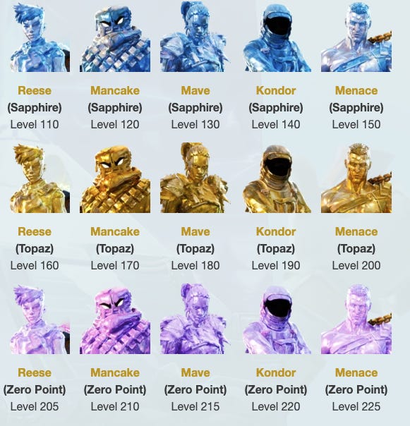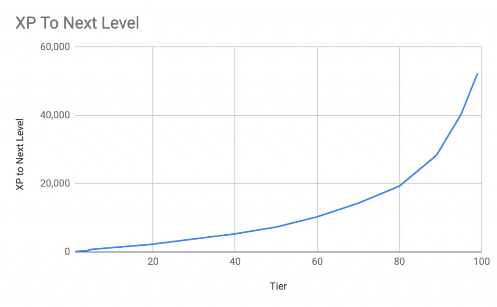 Không có tiêu chí cụ thể nào cho việc định giá cấp độ trong gói nhiệm vụ cao cấp. Hầu hết các trò chơi sử dụng thời gian theo hàm mũ để tạo đường cong trên sơ đồ phát triển, để cấp độ sau cần nhiều kinh nghiệm và thời gian để hoàn thành hơn cấp độ trước. Dưới đây là ví dụ cho Fortnite chương I, mùa bốn: