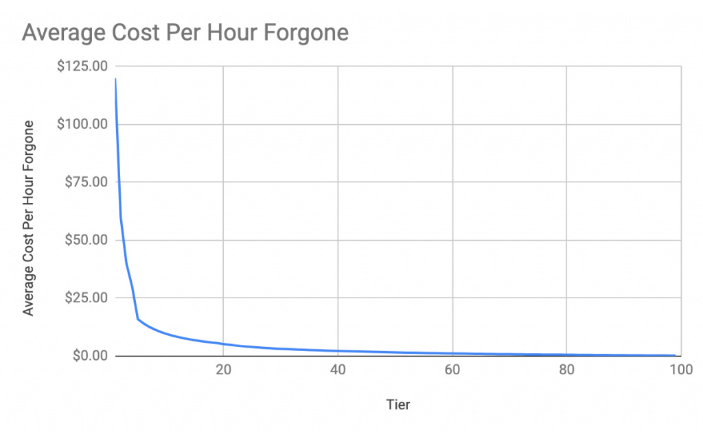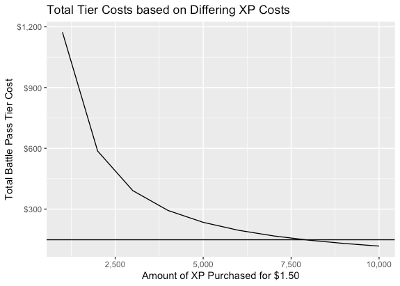 Không giống như RPG, tỷ lệ kiếm được kinh nghiệm trong hệ thống BP thường không tăng theo thời gian, giá mỗi cấp độ thì luôn cố định ở mức 1,5 đô la. Bằng cách chia cho thời gian kiếm tiền trung bình, bạn sẽ thấy chi phí cho một giờ chơi thay đổi liên tục. Ví dụ, bạn cần 6,5 giờ chơi để hoàn thành cấp 100. Nếu bạn chọn mua cấp 100 với mức giá 1,5 đô la, mỗi giờ chơi của bạn sẽ có giá 0,23 đô la. Trong khi đó cấp 1 chỉ tốn 12 phút, đồng nghĩa mỗi giờ chơi của bạn có giá 120 đô la!
