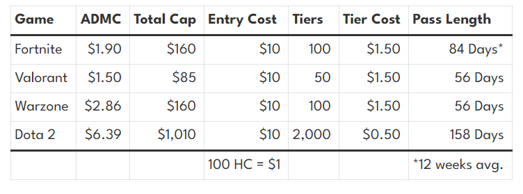 Qua bảng, ta thấy mỗi trò chơi lại có một cách tiếp cận khác nhau. Một số trò chơi chọn BP nhiều bậc với thời lượng dài trong khi một số trò khác chọn BP ít bậc với thời lượng ngắn. Nhưng điều quan trọng là phải xem xét các số liệu trong khoảng thời gian dài một năm. Dota 2 có ADMC tăng 200% so với Fortnite trong khi Valve chỉ phát hành BP mỗi năm một lần. Warzone thì mở BP 100 cấp trong khoảng thời gian 8 tuần, tức là khoảng 5 đến 6 đợt BP một năm.